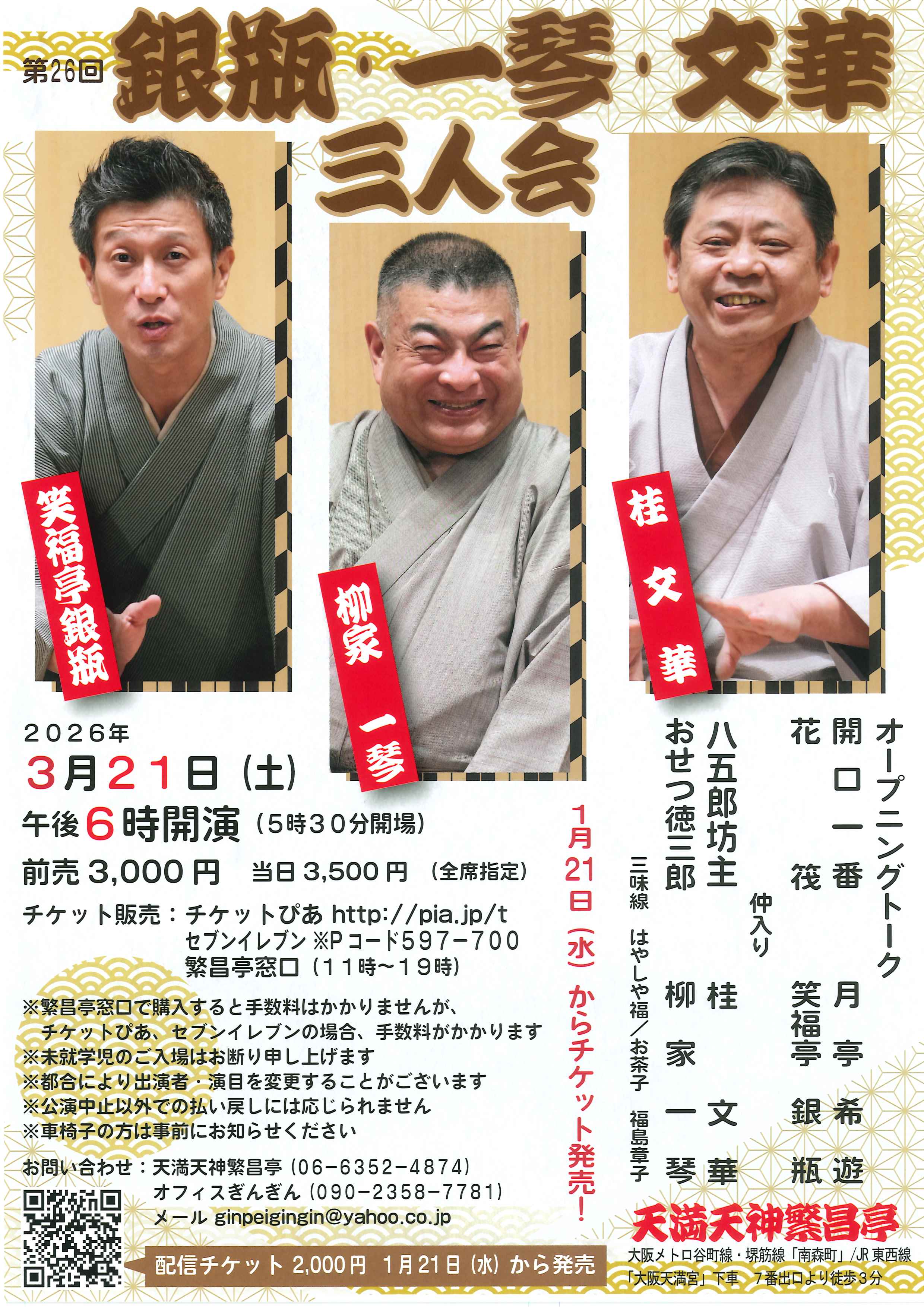 出演者 :オープニングトーク/月亭希遊「開口一番」/笑福亭銀瓶「花筏」/仲入り/桂文華「八五郎坊主」/柳家一琴「おせつ徳三郎」
